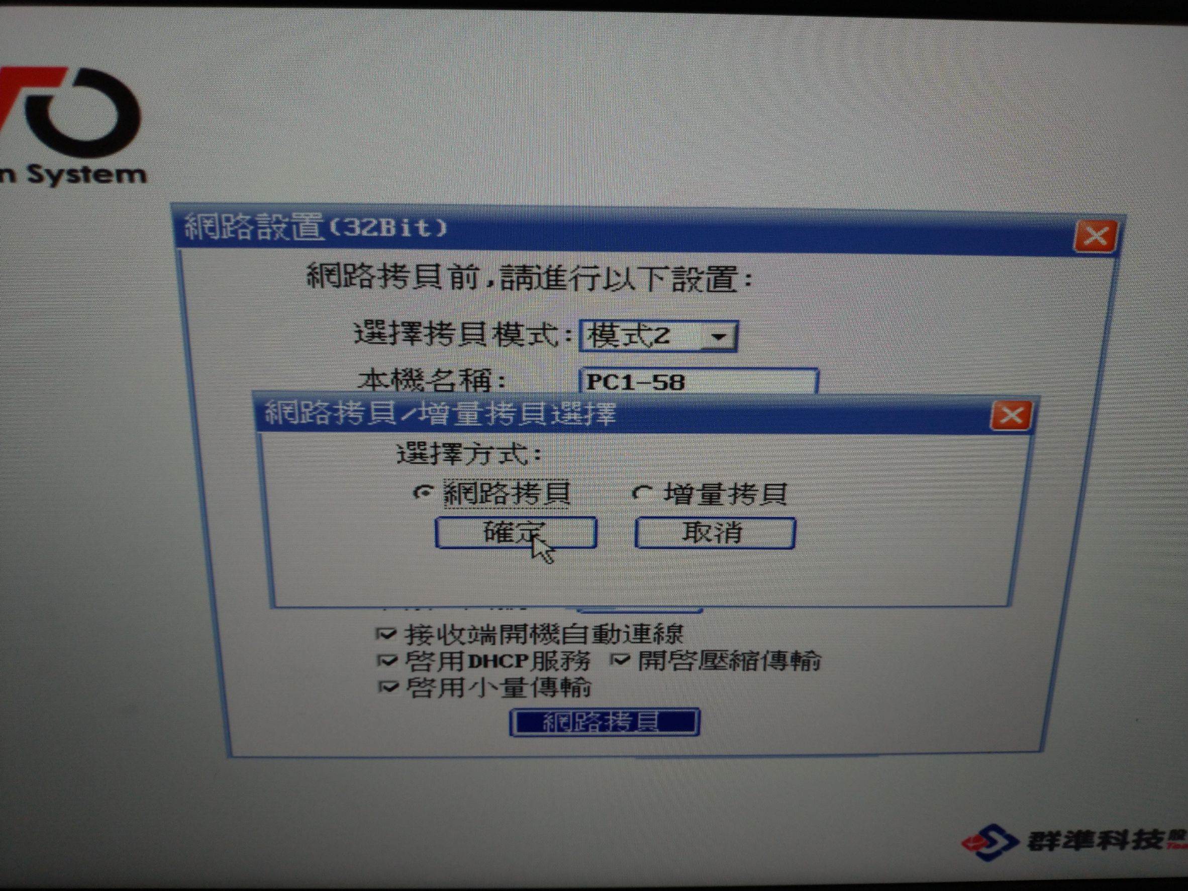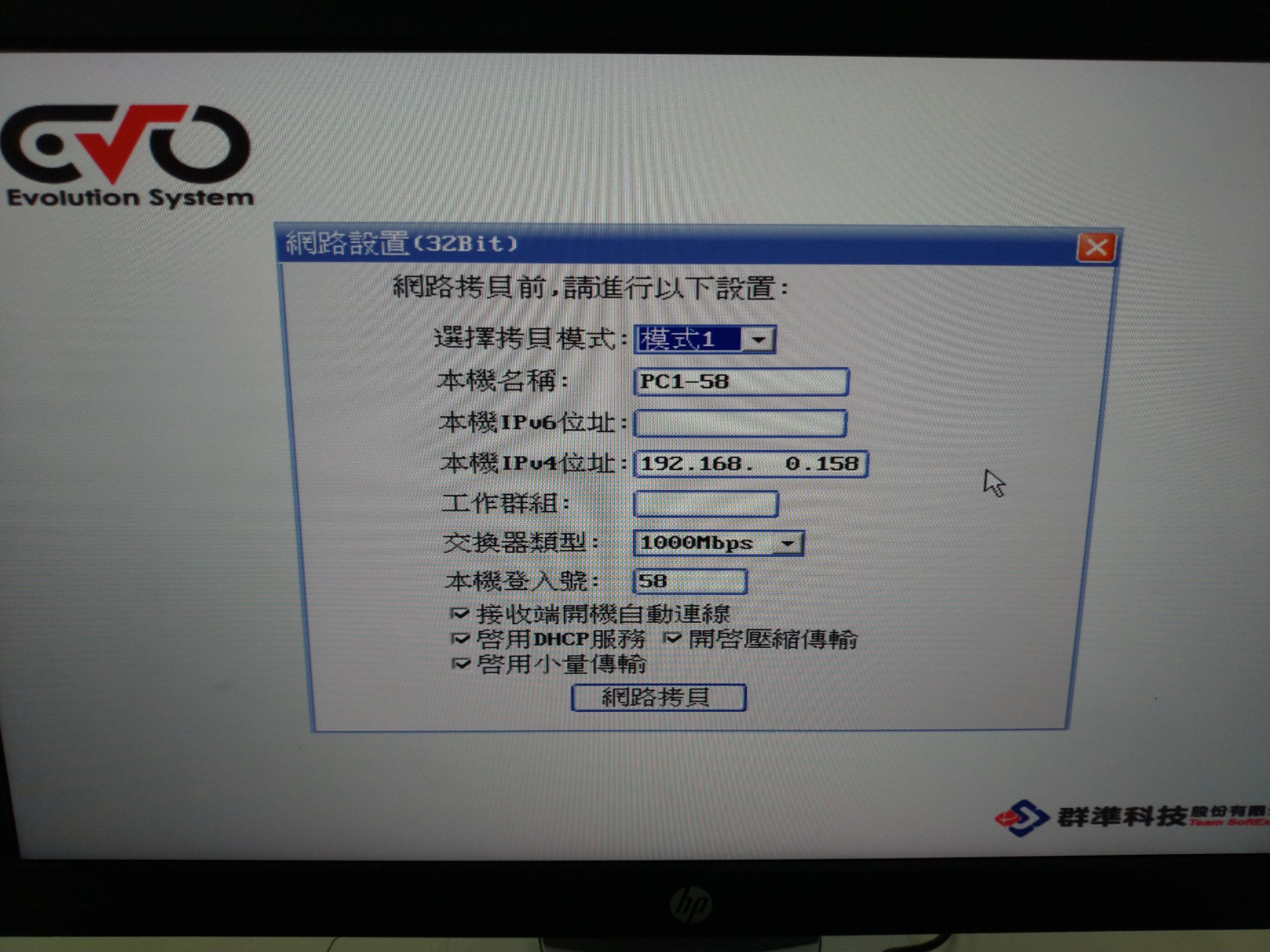設定好按套用設定,再進行網路拷貝(按網路拷貝按鈕)。選擇"模式1"為拷貝模式,確認接收端開機自動連線是勾選。按網路拷貝按鈕