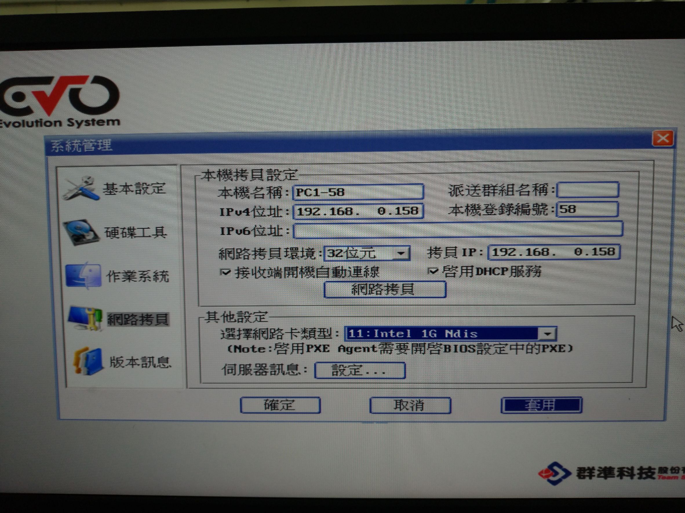 網路拷貝:將整個選擇的磁區內容、設定複製過去。覆蓋。